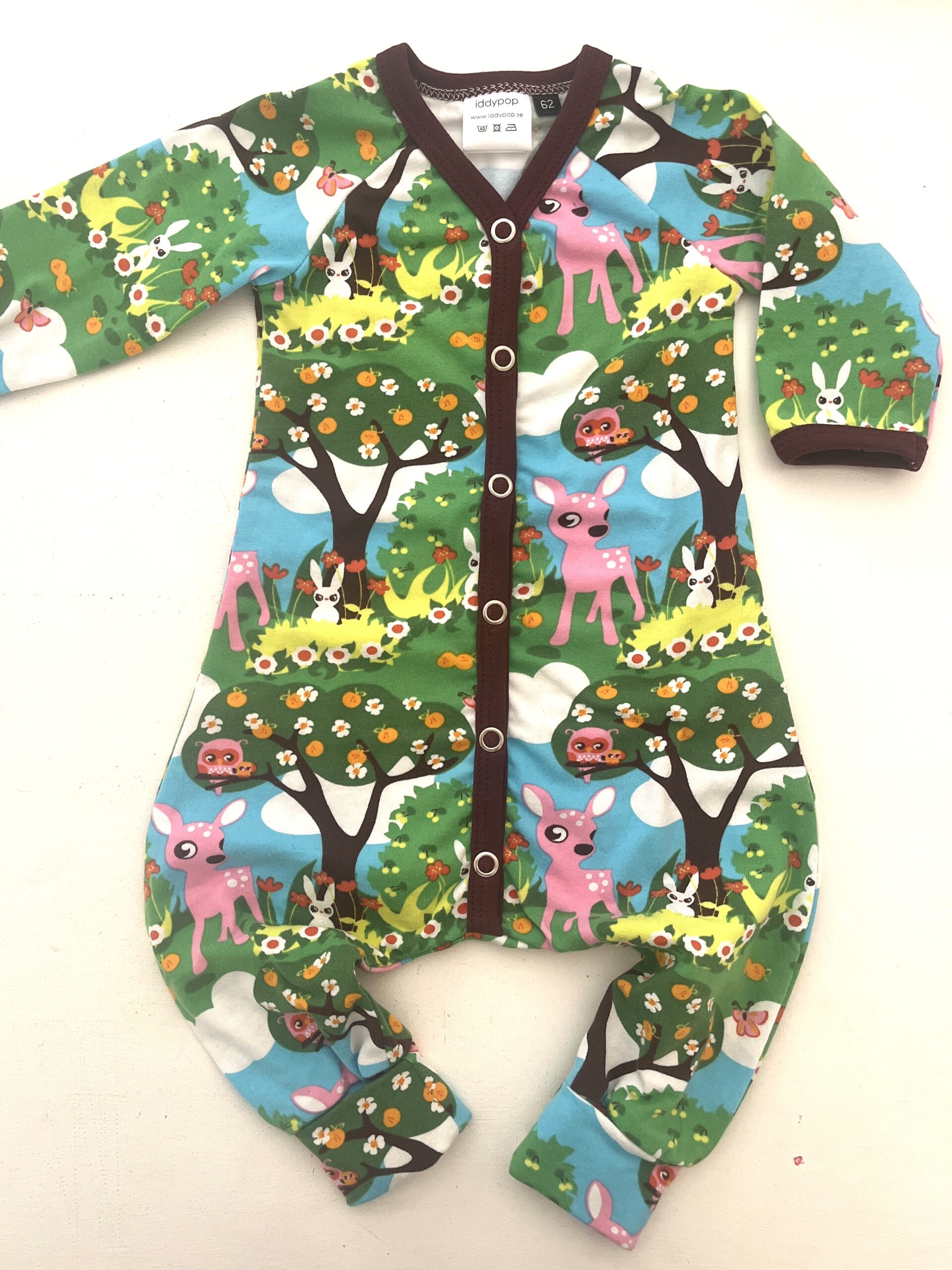Pyjamas i storlek 62. Brunröda kantband och lång mysig mudd i benslut. Retroinspirerat tyg.